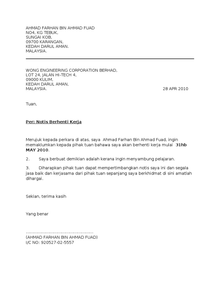 Hanya mengikuti beberapa format penulisan surat anda mampu menulis sendiri surat rasmi berhenti kerja. Berikut disertakan contoh surat notis berhenti kerja resignation letter dalam Bahasa Malaysia untuk panduan semua. Surat Peletakan jawatan untuk Alasan Pribadi.